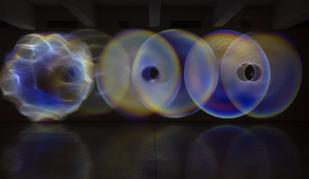 Sitting in the small, dark, theater-like exhibition space, orchestral sounds overwhelmed me. My body could feel slight vibrations accompanying the loud sound, while all I could see were circles of colors shapeshifting in accordance with the sounds. Icelandic–Danish artist Olafur Eliasson’s solo show at Tanya Bonakdar Gallery titled "Your psychoacoustic light ensemble" consists of two installations, a series of watercolors that conjure the “evanescent luminosity of a rainbow on paper,” and two polyhedrons sculpture works. The centerpiece of the exhibition is an installation artwork that transforms and integrates the intangible light and sound into a unified, immersive experience. Dynamic color-changing pupil-shaped illuminations on the wall synchronize with the symphony-like sound effects, operating at the same vibrational frequency and rhythm. In essence, the artwork creates a multisensory environment that invites viewers to experience light and sound as well as how they interact with each other.